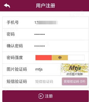 4、进入用户注册页面,填写手机号、密码、接受手机验证码,开始注册。