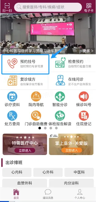 1、完成添加就诊人流程后,进入首页,点击“预约挂号”,正式进入挂号流程。