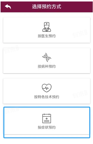 2、点击后将出现“选择预约方式”页面,根据自身情况来选择科室挂号。这里教授选择的是“按症状预约”。