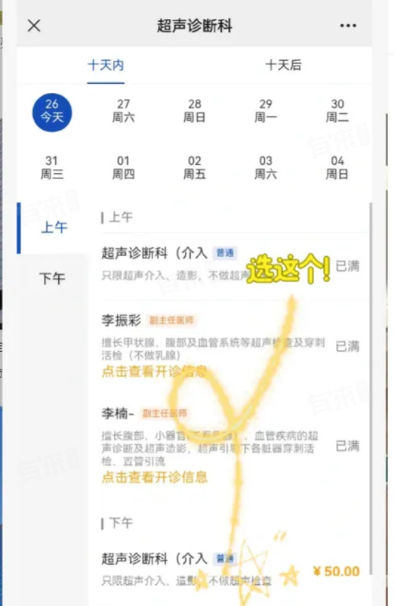 2、如果约不到专家号,可以约周一,三,五下午的普通号,全称为超声诊断科(介入)。这是罗渝昆教授团队的会诊,同样可以帮你现场彩超,然后评估是否能做消融。