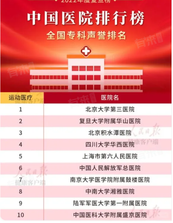 2022年中国医院排行榜发布,新增运动医学学科。下面教授为大家盘点一下运动医学科、骨科、康复医学科排名前十的医院: