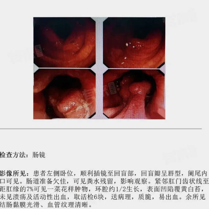 住院后,医生安排我爸做了肠镜检查,检查的时候肠道准备得不太好,有粪水残留,但还是看到在紧邻肛门齿状线到距肛缘的7% 处,有个菜花样的肿物,取了6块组织去做活检。
