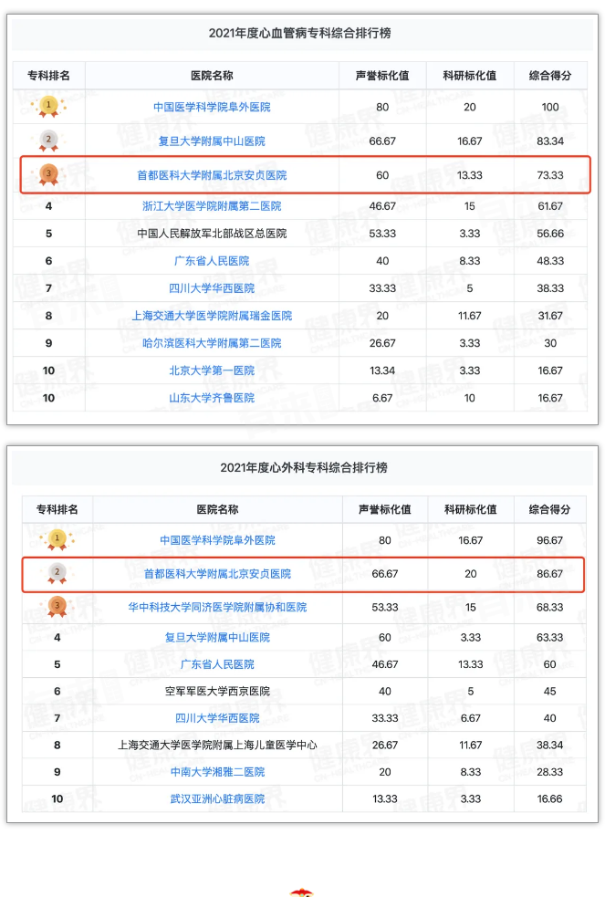 在2021“复旦版中国医院综合排行榜”中,北京安贞医院的综合排名为50位,心血管病专科排名第三位,心外科、心内科均排名第二位。