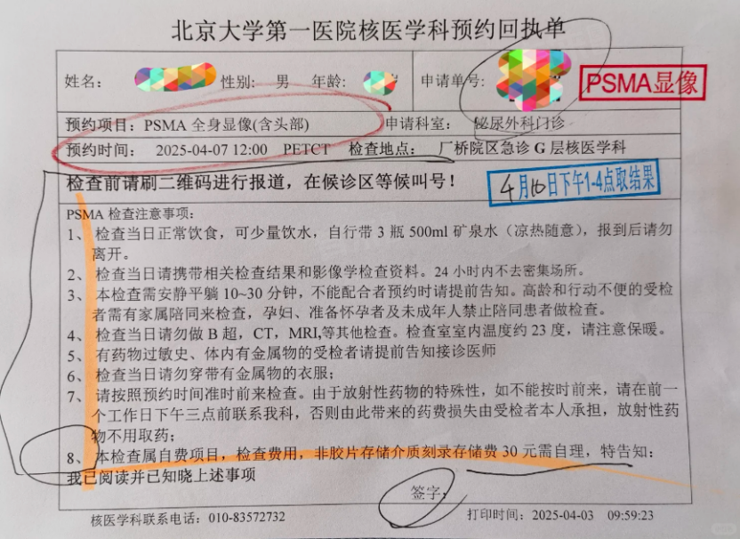入院登记与PSMA 检查契机:开完入院证记得5-7天内打电话登记,医生可能忘说但入院单上有提示。