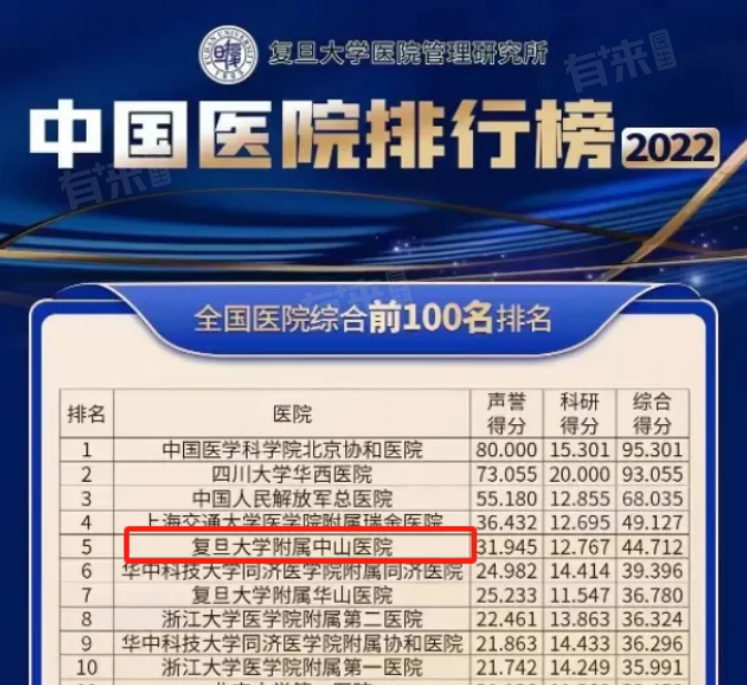 在最新发布的复旦版《2022年度中国医院综合排行榜》上,复旦大学附属中山医院排名第五,并且已经连续多年排名前五。